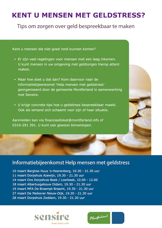 Graag wil ik u uitnodigen op de bijeenkomsten ‘kent u mensen met Geldstress?’ georganiseerd in samenwerking met Sensire.