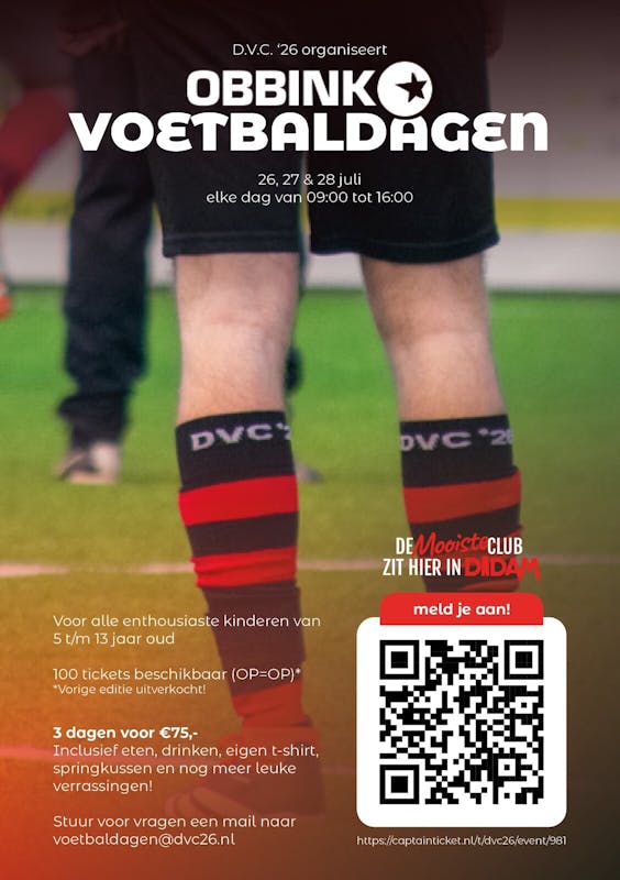 Kom naar de voetbaldagen 2025! 3 leuke dagen voor alle kinderen van 5 tot en met 13 jaar! Meld je snel aan, de eerste kaarten zijn ondertussen al verkocht!! Dat kan je via deze link: https://captainticket.nl/t/dvc26/event/981