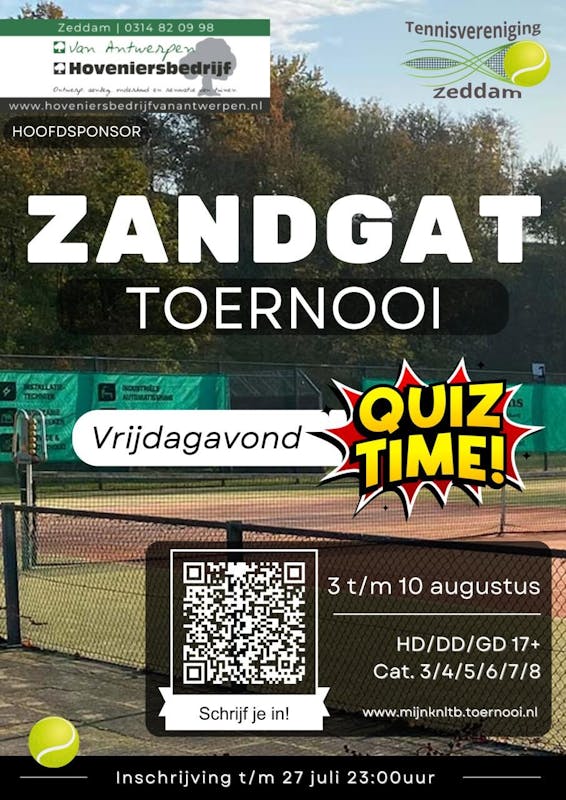 Ons jaarlijkse tennistoernooi vindt dit jaar plaats van 3 tot en met 10 augustus (week 32) in het Zandgat in Zeddam.