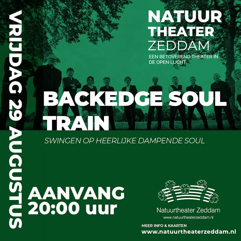 Houd je van een swingende soulavond? Kom dan naar het optreden van Backedge Soultrain. Deze vrolijke en energieke band speelt op vrijdagavond 29 augustus om 20.00 uur in het Natuurtheater Zeddam.