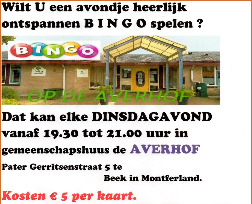 Gezellig BINGO spelen ? In gemeenschapshuis de AVERHOF in Beek kan dit elke dinsdagavond. Dit is een KBO-activiteit.