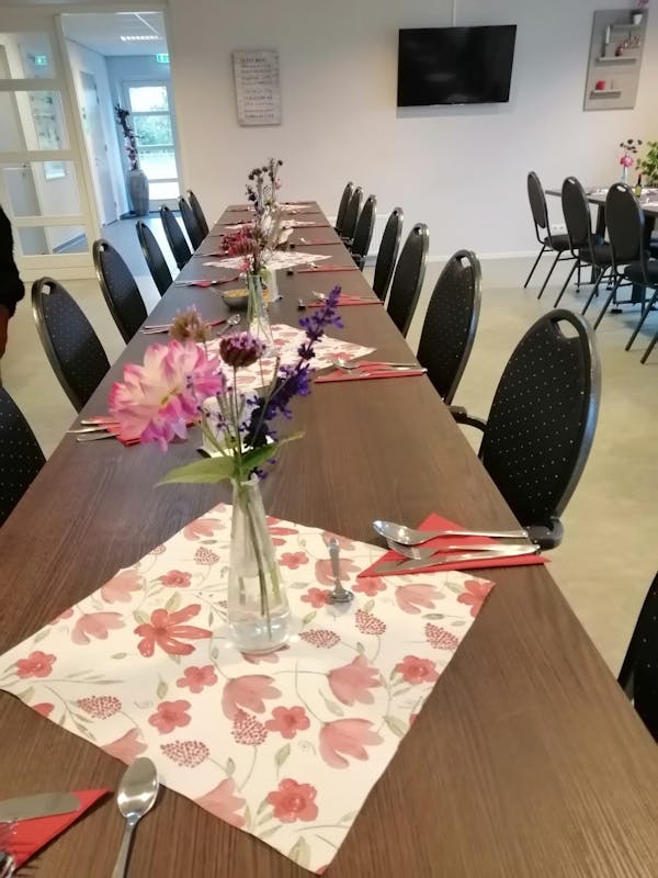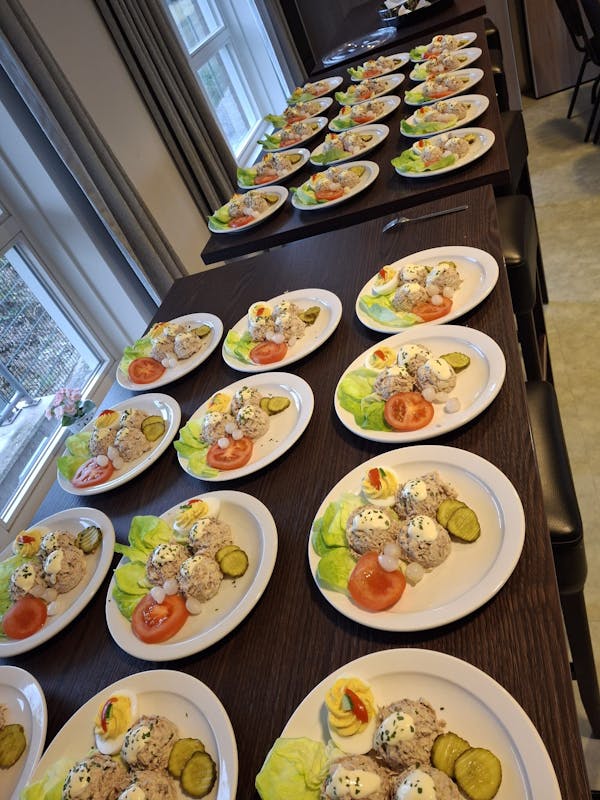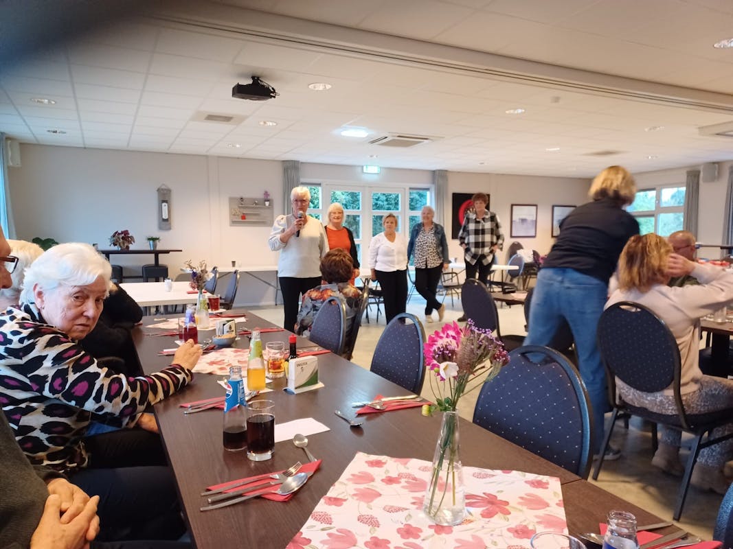 Deze bestond uit een heerlijke soep van bouillon met groente en gehaktballetjes. Daarnaast vers stokbrood met een zelf gemaakte kruidenboter. Het hoofdgerecht was een heerlijk slaatje met toebehoren.