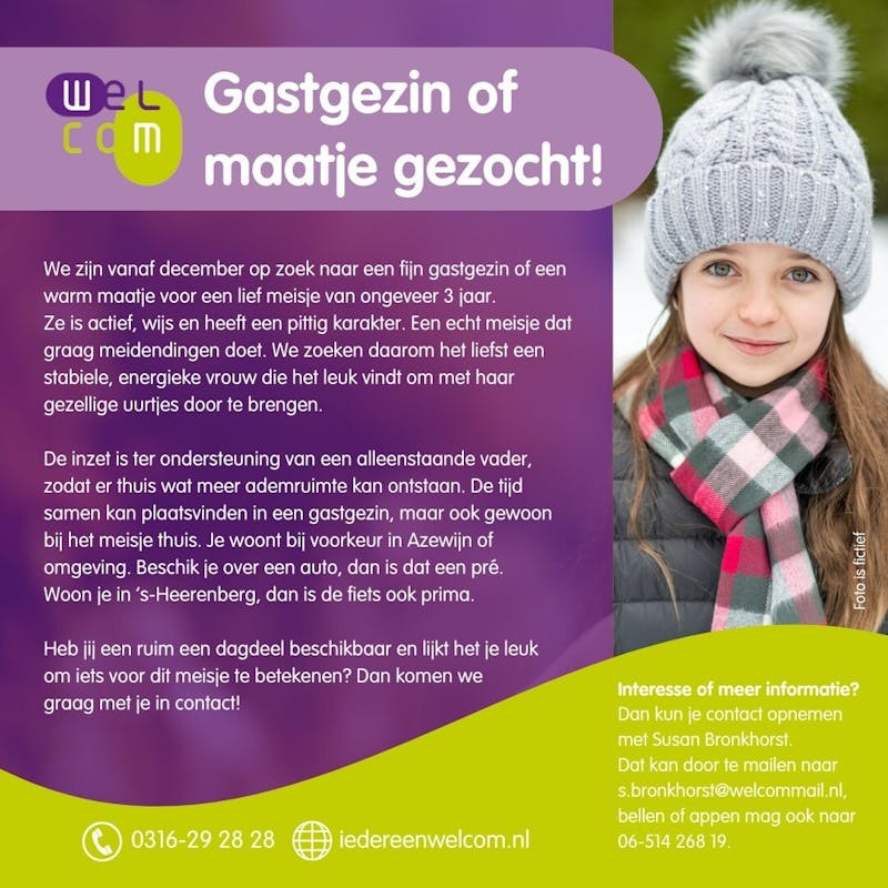Gezocht: een warm maatje of gastgezin voor een energiek meisje van 3 jaar, ter ondersteuning van haar alleenstaande vader. Heb jij een dagdeel over? Laat het ons weten!