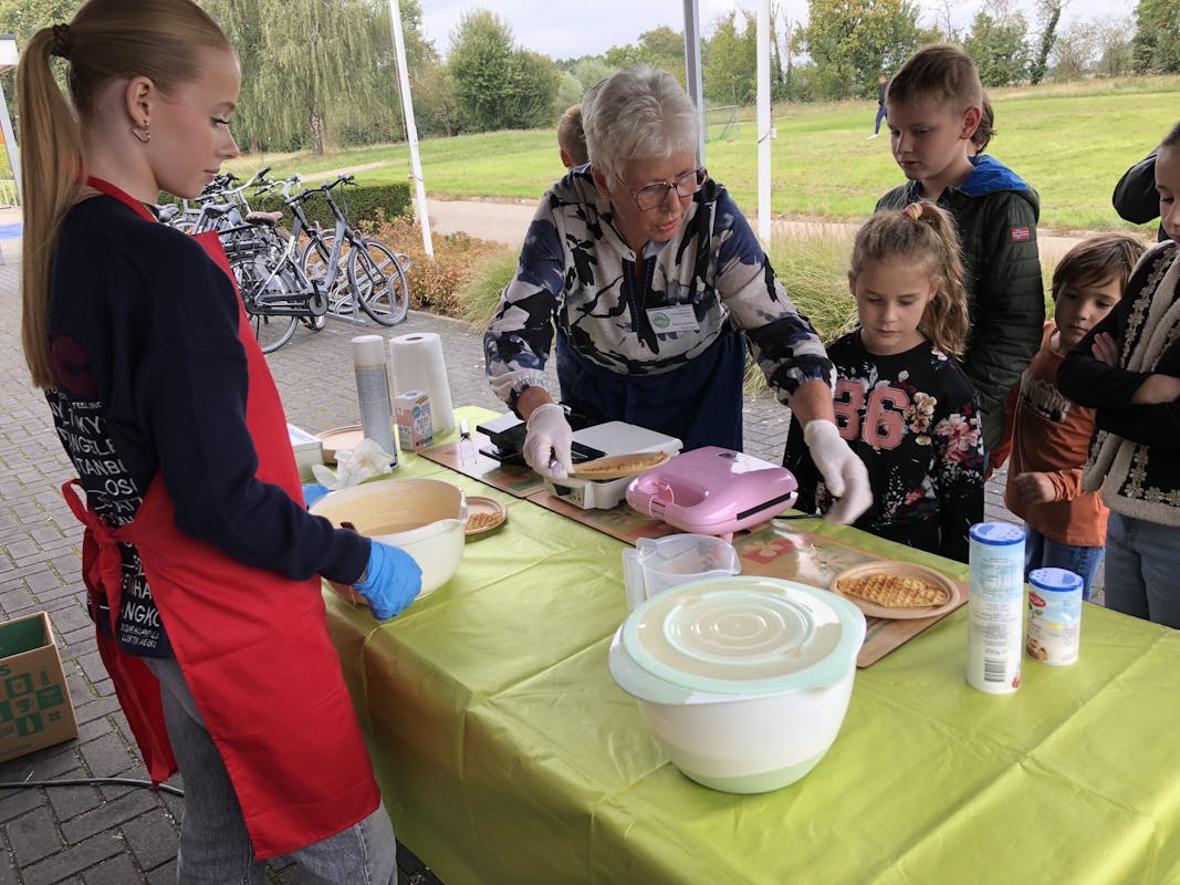 Na al die mooie woorden moesten we maar eens “echt” beginnen: de verenigingen presenteerden zich en Stitch stond alle gastjes en gasten op te wachten. De kinderen wilden graag geknuffeld worden. Lauren en Bernadette gingen snel aan de slag en bakten wafels voor iedereen die wilde. Nou, daar lustten de kinderen (en hun ouders) wel pap van!