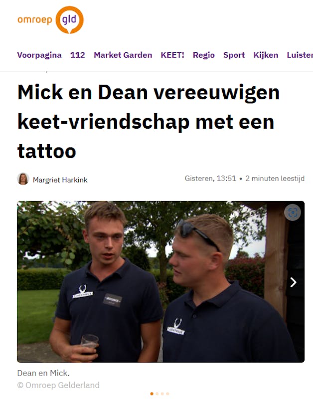 Deze informatie hebben we via de website van omroep gelderland. het hele artikel lees je hier: Mick en Dean vereeuwigen keet-vriendschap met een tattoo - Omroep Gelderland (gld.nl)