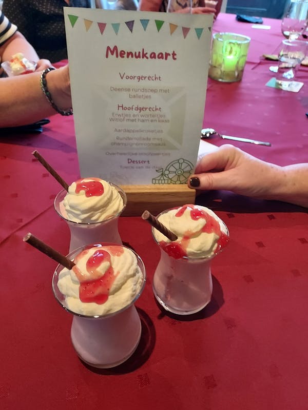 Rundsoep, runderrollade, champignonroomsaus, witlof in ham en kaas, erwtjes en worteltjes, aardappelkrokketjes, stoofpeertjes en aardbeienbavarois.