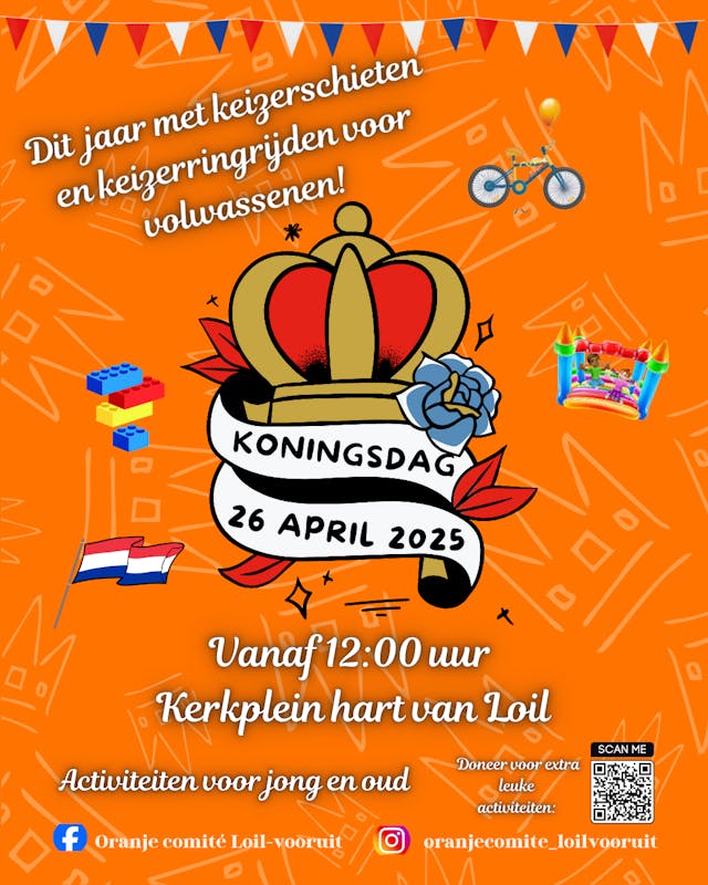Na leuke en gezellige vorige edities, willen we ook dit jaar weer met jong en oud het glas heffen tijdens Koningsnacht in Eventkerk 7e hemel in Loil ! Vrijdag 25 april om 20:30 uur in ’t Hart van Loil. De tickets zijn € 5,- voorverkoop en €10,- aan de deur. Leeftijd is 16+.