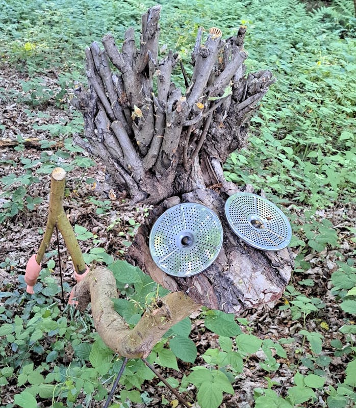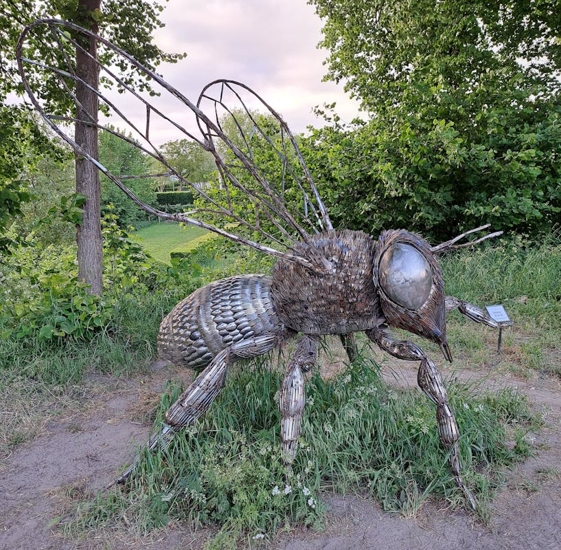 Even later, nog maar net bekomen van de vorige ontmoeting, staat er een indrukwekkende reuze bij aan de kant van de weg. Hij is gemaakt van bestek waarmee we ons voedsel nuttigen. De bij is niet alleen prachtig om te zien maar heeft ons ook wat te vertellen. Hij staat voor al die bijen die bedreigd worden of al uitgestorven zijn.