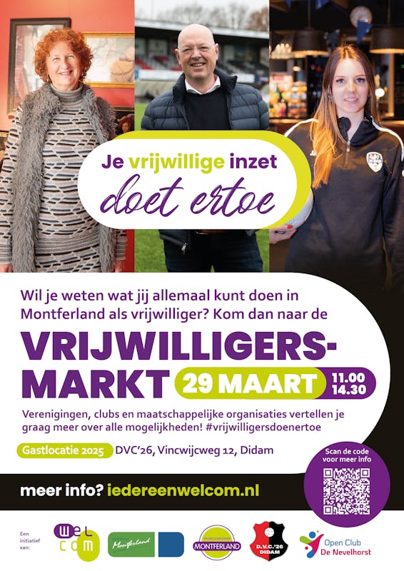 Wil jij weten wat je allemaal kunt doen in Montferland als vrijwilliger of wil je voor bijvoorbeeld je vereniging vrijwilligers werven? Kom dan naar de vrijwilligersmarkt op zaterdag 29 maart tussen 11:00 en 14:30!